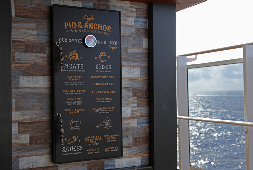 Guy’s Pig & Anchor serves approximately 200 pounds of pork butt at each BBQ venue per day. That’s a whole lot of pork, especially since the restaurant stays open for only a few hours during sea days.