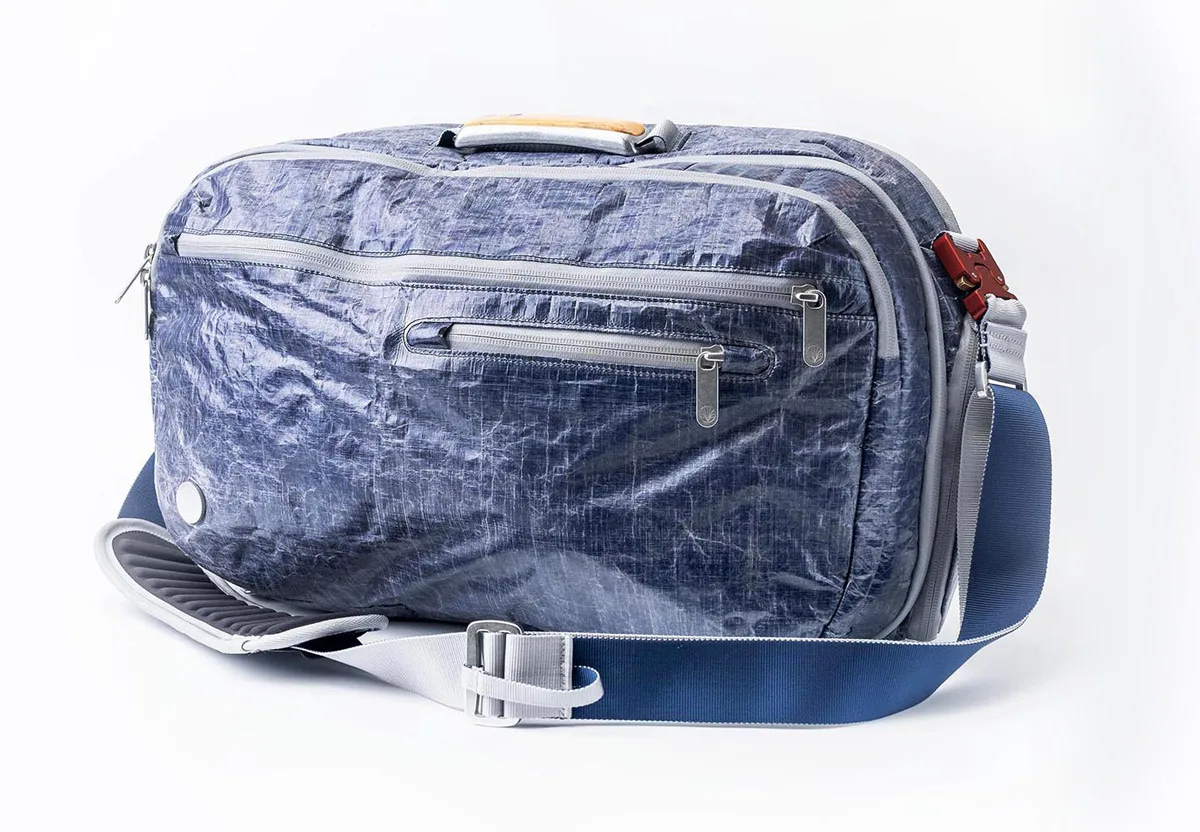 The materials make the case. The exterior is Dyneema—a fabric 15 times stronger than steel and light enough to float. The handle is aluminum with a hand-milled wood inlay that feels more like something from a luxury car interior than luggage. Precision AustriAlpin clips keep everything locked down, while the bag’s Triple Carry design lets it shift from briefcase to backpack to messenger in seconds. It expands from 25 to 30 liters, has a hidden waterproof dopp kit built in, and even features what they call “Church pew padding” for real comfort when carrying.