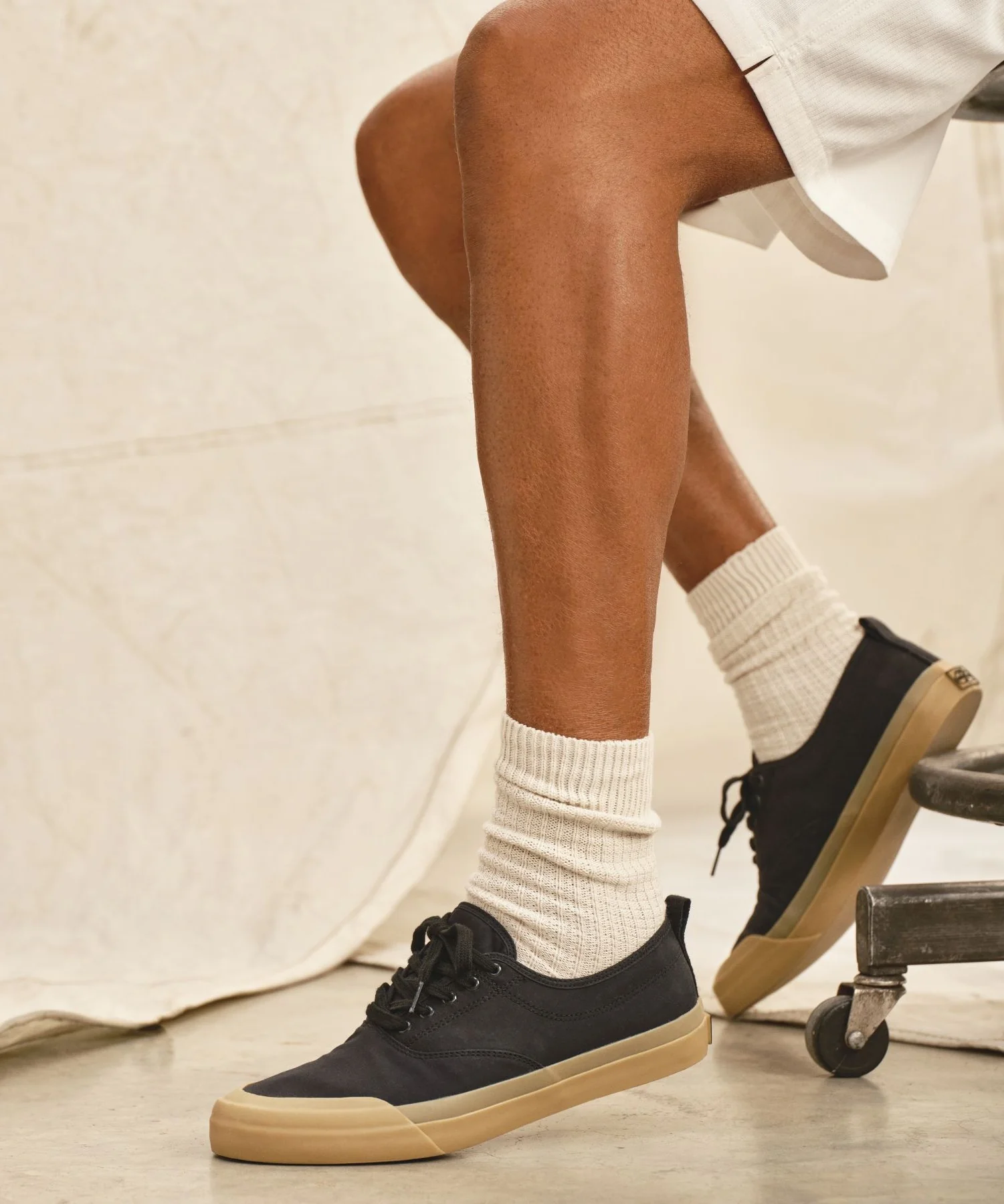 The CVO Sneaker, a nod to Sperry’s maritime roots, gets a modern overhaul with weatherproof British Ventile® fabric and a raised rubberized gum sole. Inspired by the original Circular Vamp Oxford, it features a double-layered upper, razor-cut wave Siping for traction, and a canvas lining with a heel pull tab for easy wear. Available in black and cream, it’s a versatile addition to any warm-weather rotation.
