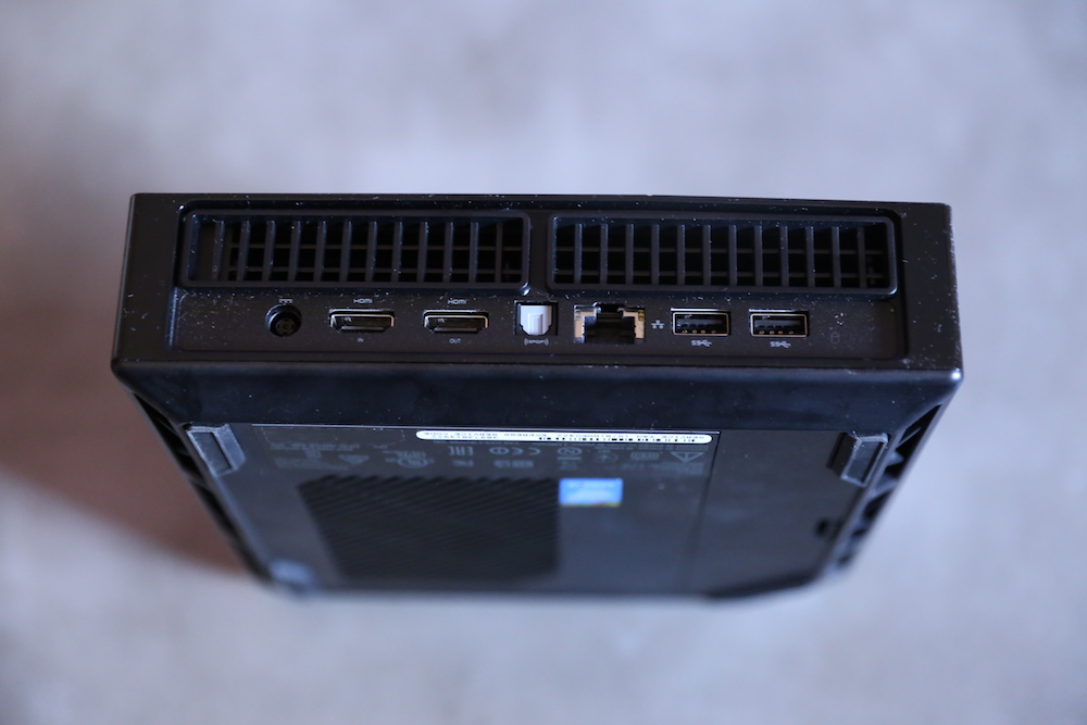 Steam Machine inputs from left to right: DC in, HDMI-In, HDMI-Out, Optical Audio Out, RJ45 GbE, (2) USB 3.0.