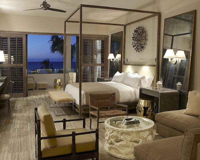 The 3679 square foot three-bedroom Penthouse features a custom-designed four-poster king bed in both the master and second bedroom, with two queen-sized beds in the third bedroom. It also has a full gourmet kitchen, dining room, living room, washer, dryer and powder room. There are ocean views from the penthouse’s terrace, where there is a large private pool and outdoor kitchen. Bathrooms in the three-bedroom Penthouse feature outdoor showers.